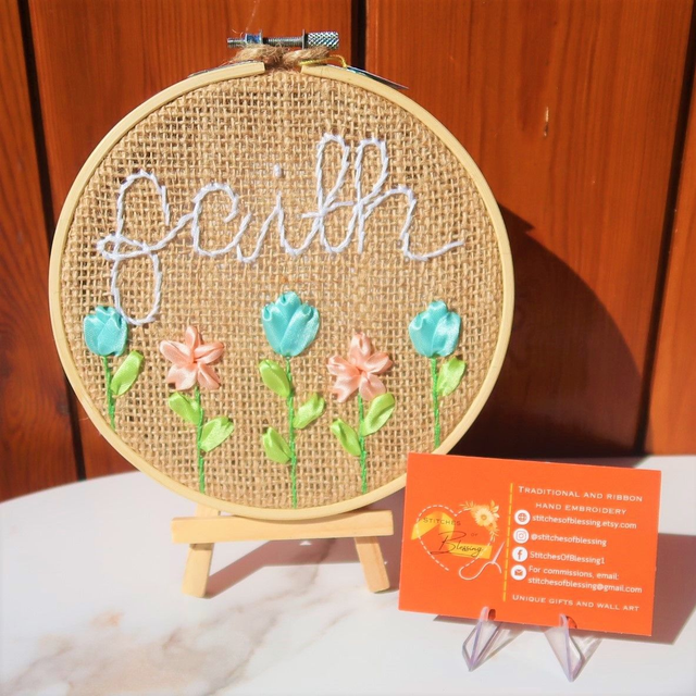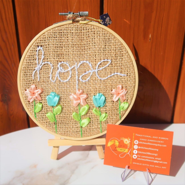 Elevate your home decor or give a meaningful gift with this 6" hand-embroidered hoop by Keren from Stitches of Blessing. Crafted on hessian, this beautiful piece features faith-related words and delicate ribbon flowers. Perfect for adding a touch of inspiration to any room, this unique decor piece is sure to be a conversation starter. Handmade with love and attention to detail, this hoop celebrates faith and beauty in a stunning way. Make a statement with this thoughtful and artful creation today.
