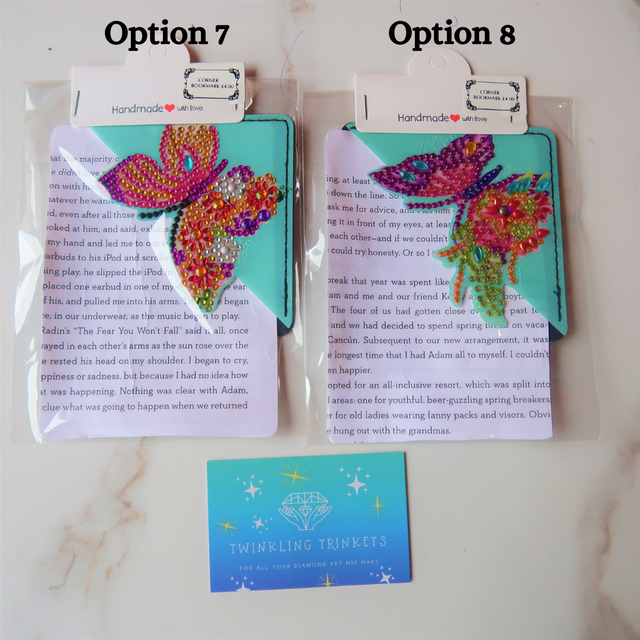 Introducing the stunning Diamond Art Butterfly Corner Bookmark by Judi from Twinkling Trinkets! Handcrafted with precision and available in various colorways, this exquisite bookmark is the perfect gift for any book lover. The intricate diamond art design adds a touch of elegance to your reading experience, while the corner style ensures it stays securely in place. Say goodbye to dog-eared pages and hello to a stylish way to keep your place in your favorite book. Treat yourself or a loved one to this unique and practical accessory today!