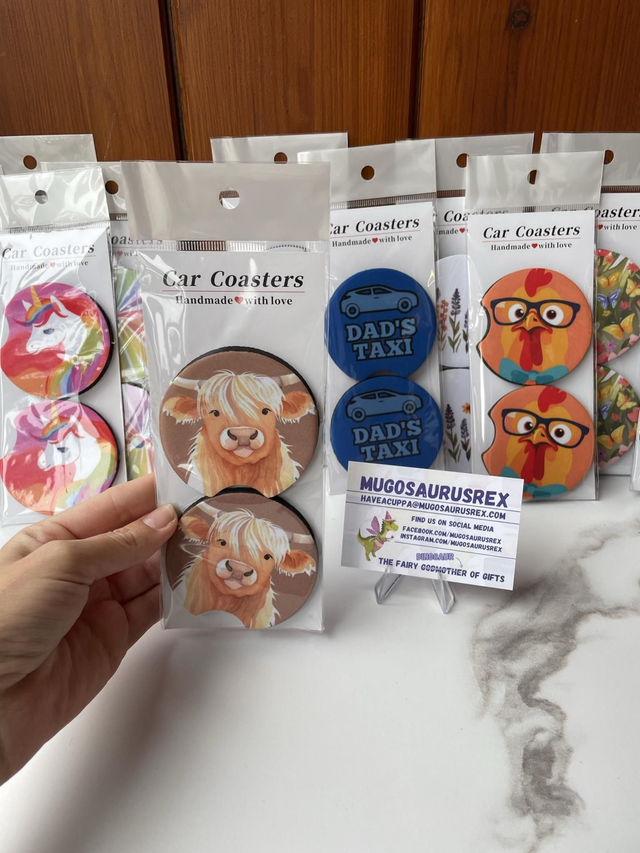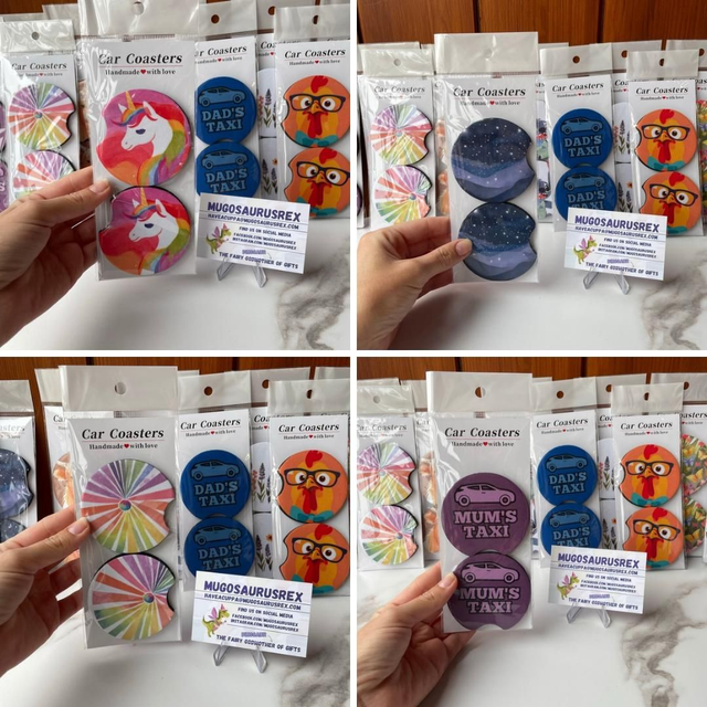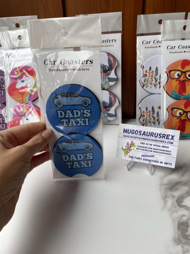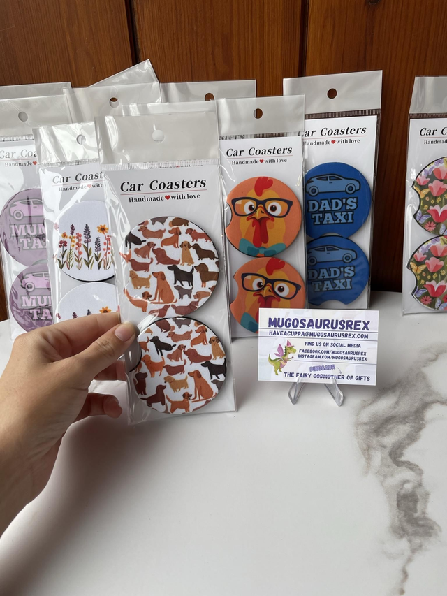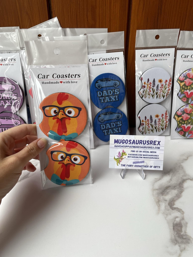 Transform your car cup holders with Car Coasters by Janie from Mugosaurusrex. Janie's unique designs are created through her own creativity and printed onto the coasters using the sublimation process. Say goodbye to messy spills and protect your cup holders in style. With various designs available, you can match to suit your personality and car interior. Make a statement while keeping your car clean and organized. Upgrade your driving experience with these stylish and functional car coasters today.