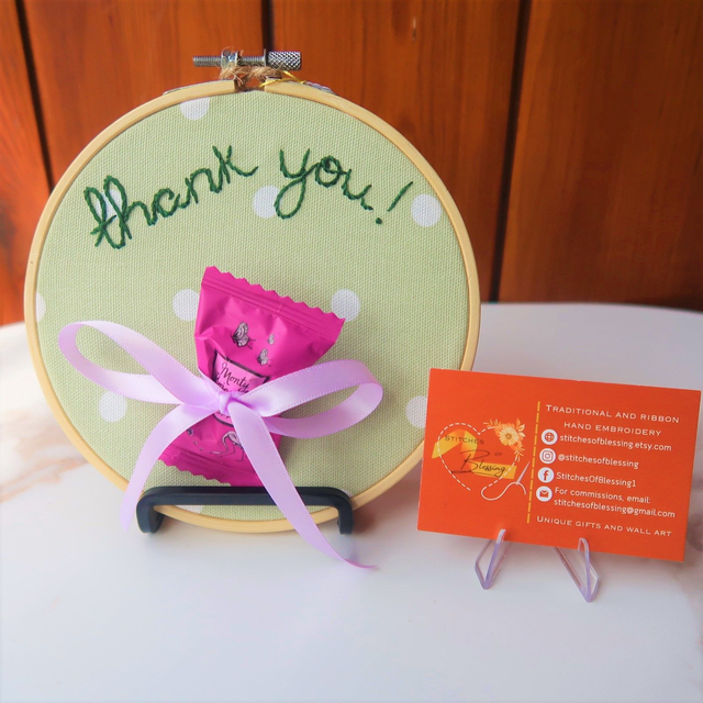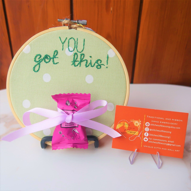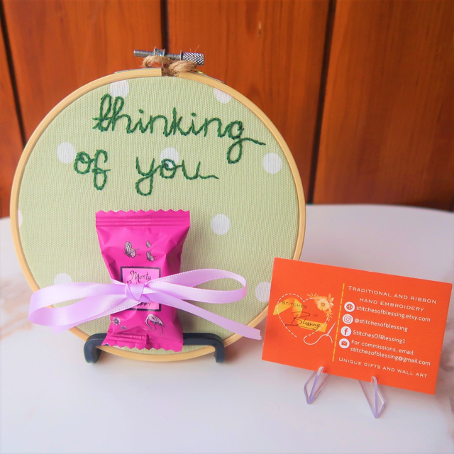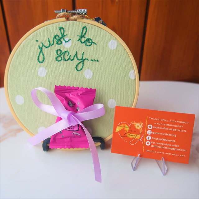 This handcrafted 6-inch embroidery hoop by Ellen from Stitches of Blessing is a unique and meaningful gift. Decorated with an embroidered sentiment and adorned with a delicious chocolate truffle attached with a ribbon, this piece is sure to delight the recipient. Once the truffle has been enjoyed, faux flowers can be easily tied in place with the ribbon for a lasting keepsake. Perfect for birthdays, holidays, or any special occasion, this versatile gift combines beautiful craftsmanship with a touch of sweetness. Surprise your loved ones with a thoughtful and charming present that they will cherish forever.
