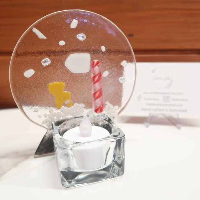 Enhance your holiday décor with a stunning Fused Glass Christmas Tealight Holder by Michelle from Shelden Glass in Somerset. This handcrafted home decor piece is the perfect gift for loved ones or a festive treat for yourself. Choose from two beautiful designs and watch as the flickering battery-operated tealight candle casts a warm glow through the glass. Elevate your Christmas spirit with this unique and elegant decoration that will bring joy and cheer to any room. Add a touch of sophistication to your festive season with this exquisite tealight holder.