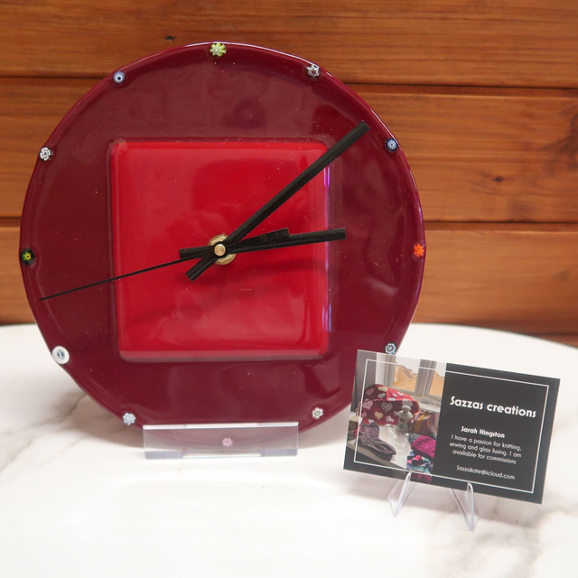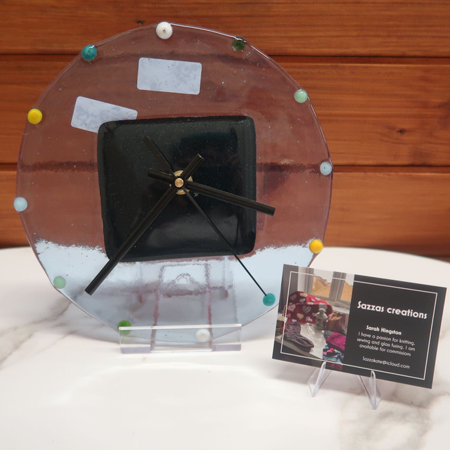 Introducing the stunning Fused Glass Clock by Sarah from Sazza's Creations! This unique timepiece comes in two mesmerizing colors to choose from, adding a pop of elegance to any space. Handcrafted with care, this clock will elevate your home decor or make a thoughtful gift for loved ones. With its beautiful design and functionality, this clock is sure to impress. Don't miss out on owning a one-of-a-kind piece from Sazza's Creations.