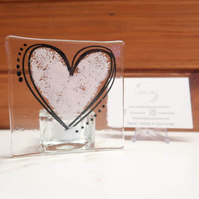 Elevate your home decor with this exquisite fused glass tealight holder by Michelle from Shelden Glass in Somerset. Each piece is meticulously handcrafted, making it a unique gift or addition to your own space. The tealight holder comes with a battery-operated tealight for safe and convenient use. Brighten up any room with the warm glow of this beautiful piece. Perfect for creating a relaxing ambiance during special occasions or everyday use. Add a touch of elegance to your home with this stunning tealight holder.